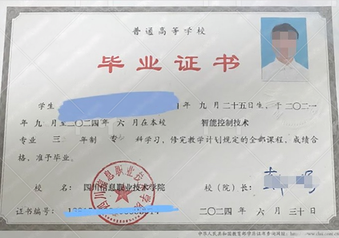 四川信息职业技术学院2024年普通全日制专科毕业证书样本图片(智能控制技术)